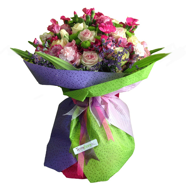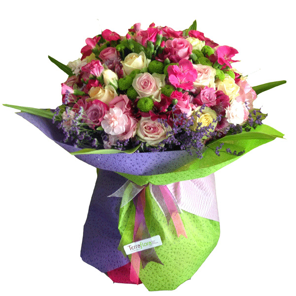 The rainbow is a mix of Green peace, Dianthus, Roses and Limonium to color up the day of your dearest