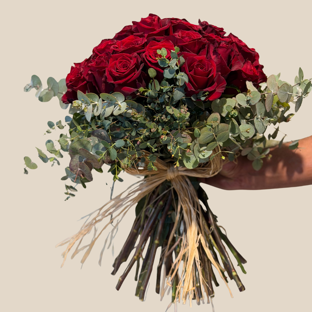 Hand-tied with care, this bouquet of 36 jumbo red roses and eucalyptus feels intimate and thoughtful. The scent of eucalyptus enhances calmness, while red roses activate emotional memories. A sensory gift that taps into the brain’s love pathways, ideal for sending warmth and affection across any distance.